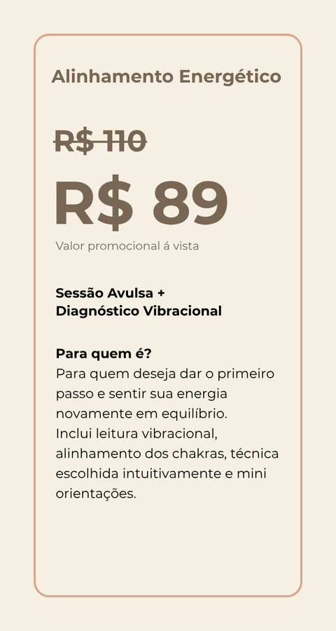 O atendimento é totalmente individualizado. Cada sessão é construída a partir da sua queixa, do seu momento atual e daquilo que o seu campo energético sinaliza como prioridade naquele encontro.