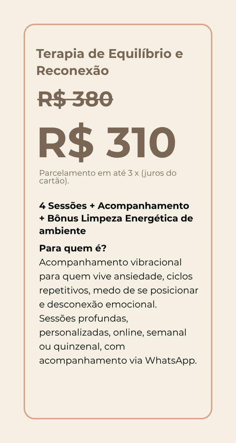 Ao reorganizar sua frequência, você retorna ao seu estado natural de equilíbrio, sua verdade e a vida naturalmente se reorganiza, trazendo mais clareza, movimento e direção.